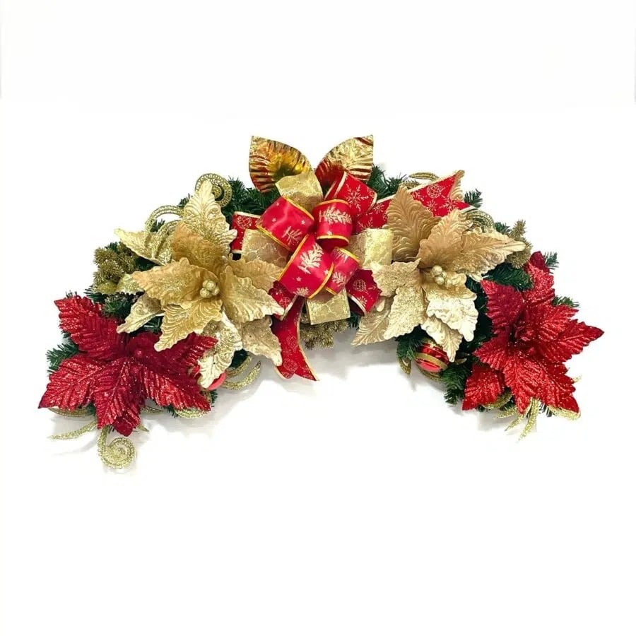 Hermoso arreglo navideño hecho en guirnalda alambrada con ponsetias, flores y cinta.